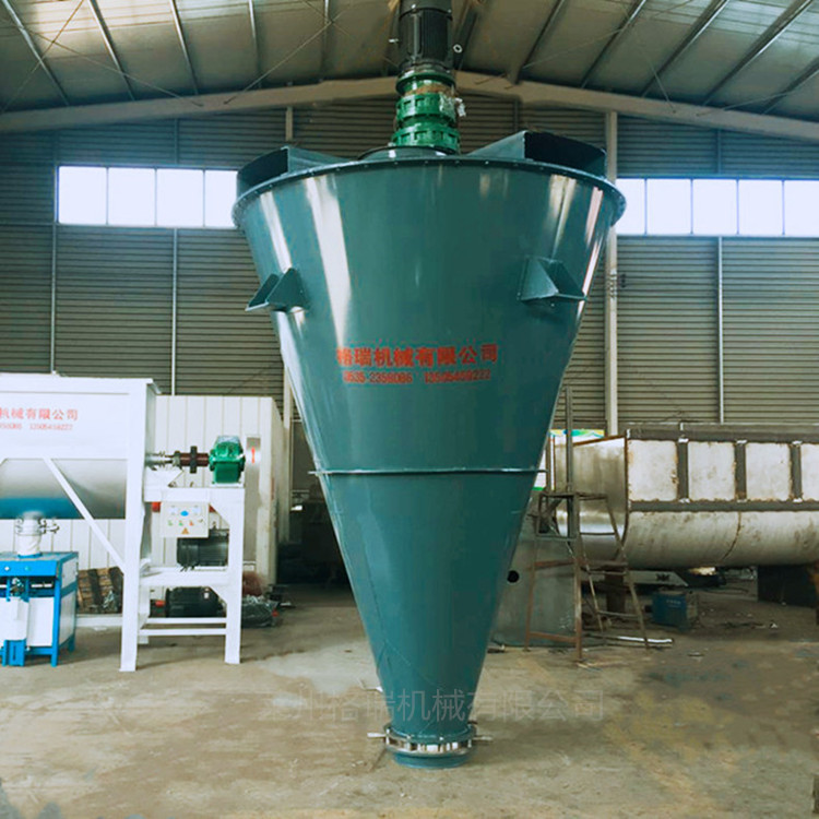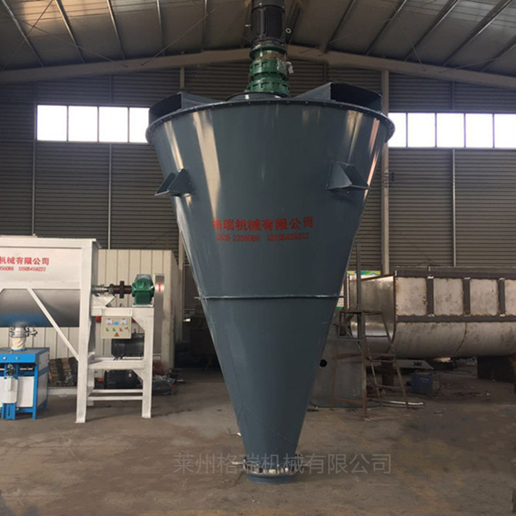 雙錐混合機(jī)由噴液裝置、傳動部分、筒蓋、螺旋、筒體、出料閥等部件組成。