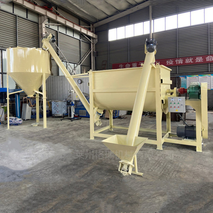 成套干粉設(shè)備由臥式螺帶混合機(jī)、上料機(jī)、攪拌罐組成,攪拌罐下面可配包裝機(jī)。