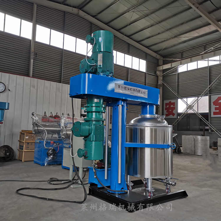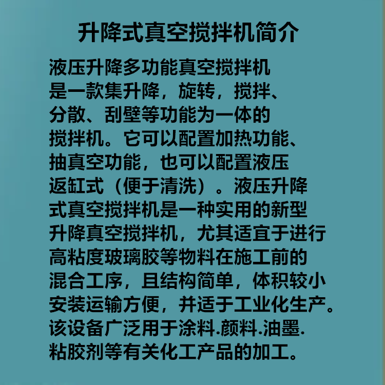 升降式真空攪拌機可以升降,旋轉(zhuǎn),攪拌分散刮壁,抽真空,也可以配置電加熱。升降式真空攪拌機由電動機全速運轉(zhuǎn)帶動主軸,經(jīng)主軸轉(zhuǎn)動攪拌框內(nèi)之四氟攪拌片,使其將桶槽內(nèi)之液體經(jīng)框槽上、下兩側(cè)之導(dǎo)流葉片吸入環(huán)狀框槽內(nèi),經(jīng)以主軸為中心高速旋轉(zhuǎn)葉片;連續(xù)使四氟攪拌片與筒體間小之間系高頻率之強力切割剪斷、粉碎,再借葉片高速離心旋轉(zhuǎn),持續(xù)循環(huán)混合,以短之時間即可完成攪拌,分散,刮壁,刮邊之作用。升降式真空攪拌機配置兩個主電機,一個高速一個慢速。高速電機作用攪拌分散作用,慢速電機刮壁,刮邊作用。本攪拌機刮壁式攪拌裝置,增進產(chǎn)品的生產(chǎn)速度,一邊攪拌一邊刮壁,攪拌物料無死角。升降式真空攪拌機 適用于化工,醫(yī)藥及食品,調(diào)理食品(醬料類)、制藥(膏霜類)、日化(膏霜類)、膠粘劑,涂料等黏度(或)濃度較高的物料的預(yù)煮、配(炒)制,攪拌,濃縮。并可按工藝需要配備真空系統(tǒng)。